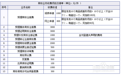② 网上申请:规费800元,目前仅对商标代理机构开放,限定本类10个商品或服务项目;10个以上(不含10个),每超过一个,另加收80元。